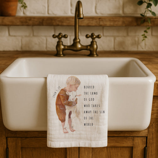 Bring gentle, faith-filled beauty into your home with this soft and timeless tea towel featuring my original watercolor painting of a young boy tenderly holding a baby lamb. This painting was inspired by a photograph taken by Andrea Martin. This piece serves as a daily reminder of Christ’s love and sacrifice: