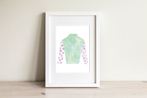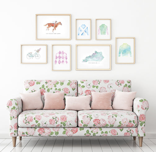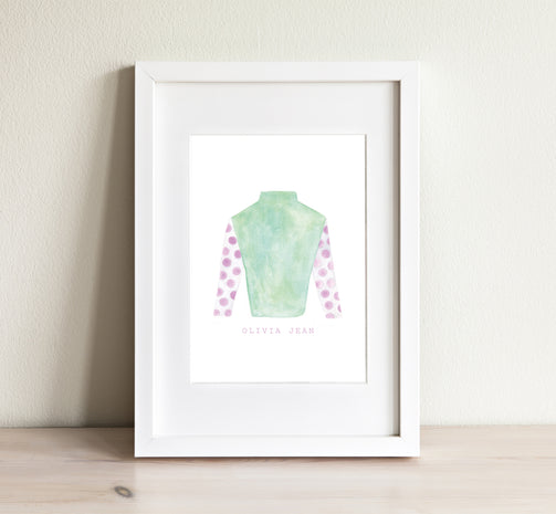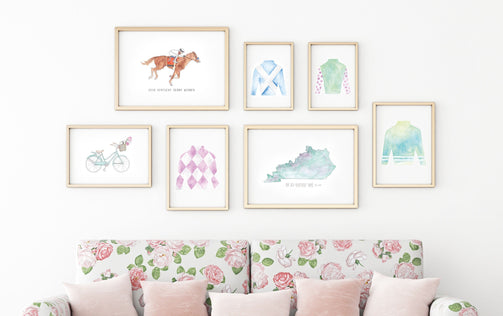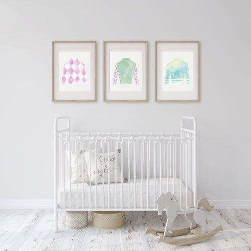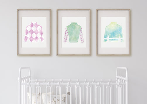 I had so much fun painting these colorful jockey silks. They look gorgeous in watercolor. These add a nice pop of color to any room. I think they would make a fun nursery theme too. I now offer name personalization to my jockey silk prints! Adding baby's name to the art print gives a special extra touch.