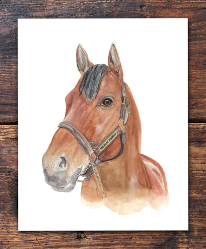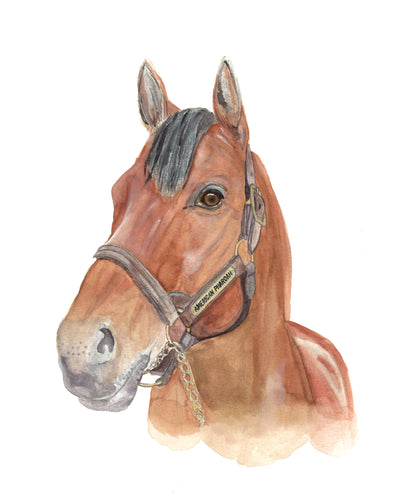 American Pharoah was so fun to paint in watercolor. This would make such a cool addition to your gallery wall. This is the second horse portrait of my triple crown winner collection. So stay tuned for more derby horse winners to add to your wall.